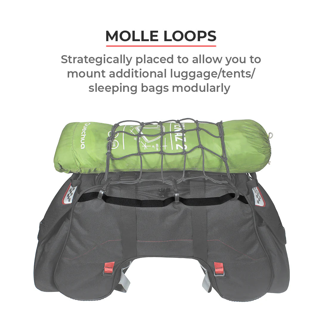 Launched in 2013 as India's first hybrid tail + saddle bag, Claw is our most popular bag in India and internationally. With a 72L capacity, this universal luggage system carries enough for a 2-3 week trip (if you pack right!) and works on almost all motorcycles. Using the MOLLE loop system and compression straps, you can choose to add on a 2/3 person camping tent, a sleeping bag or the POD 12L/ POD 22L expanders to better organize & separate out your stuff. The bag comes with an external rain cover and a detachable shoulder belt.